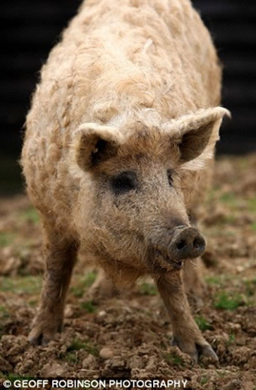 A primera vista uno se confunde, este extraño animal parece un cerdo pero su cuerpo cubierto de lana parece desmentirlo, o ¿será acaso que es un cerdo-oveja?